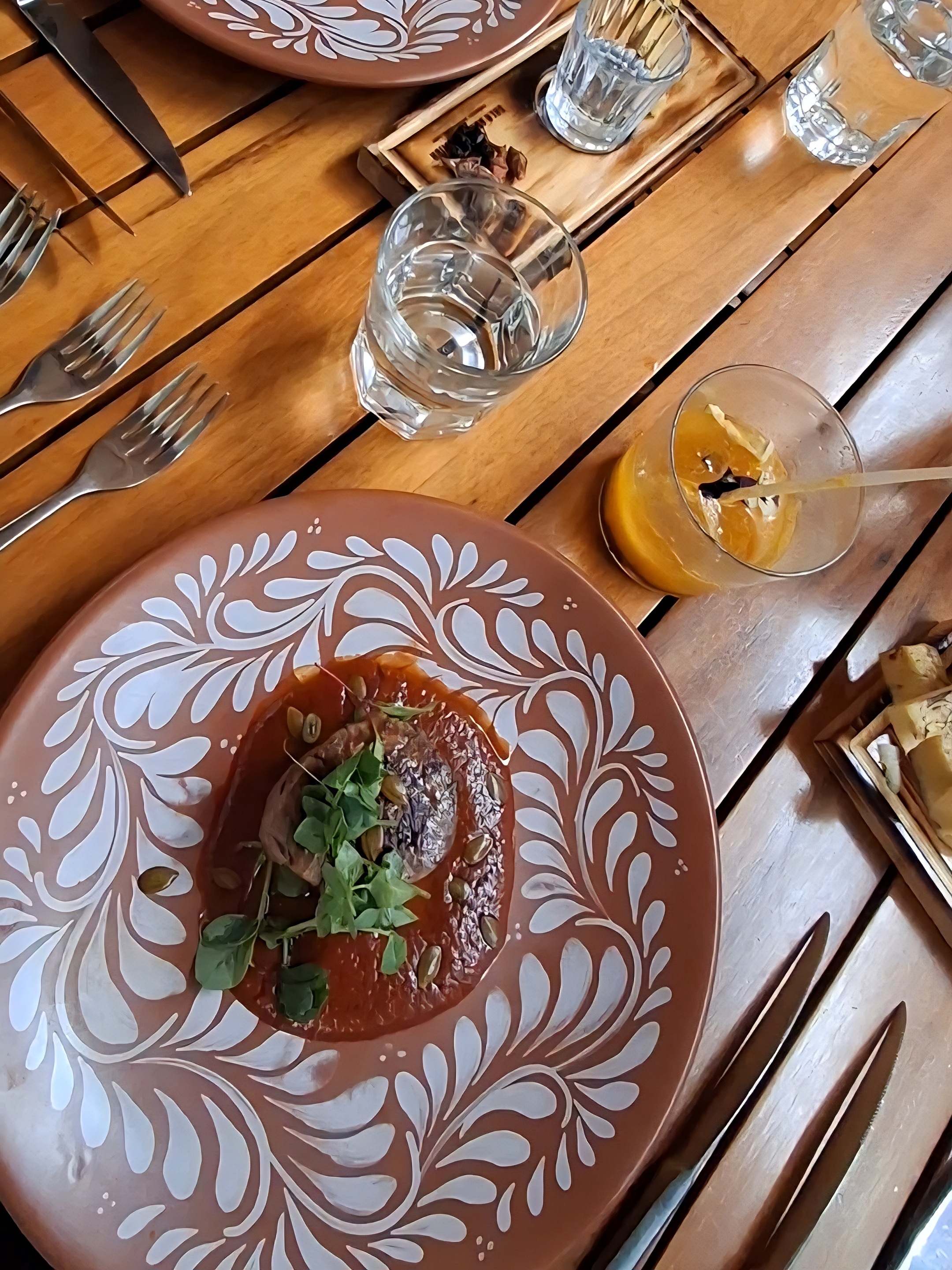 Inmediatamente nos sentaron en la mesa, en lo que nos entregaban menú me puse a curiosear, y puedo decir que el lugar está muy agradable, estuvimos en terraza, bajo sombrillas que nos cubrían de la lluvia ligera, rodeados de árboles. No es lo que uno suele pensar del corazón de la Ciudad de México.