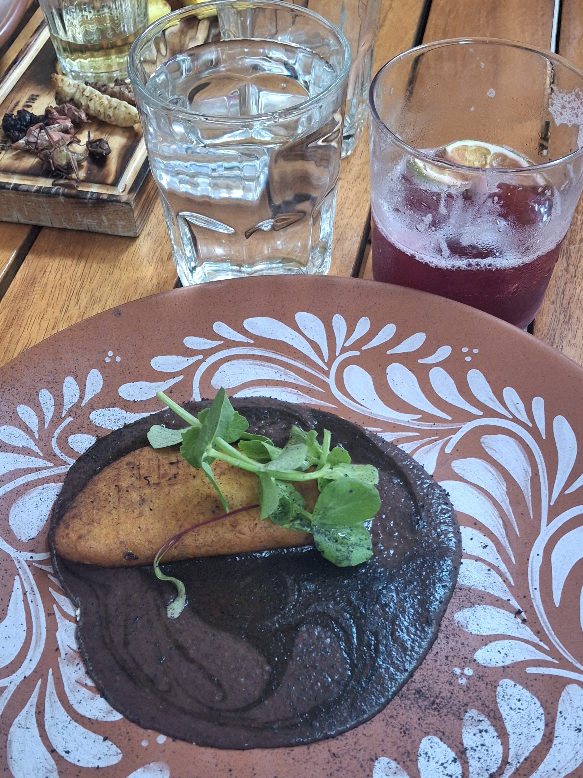 Comimos unos elotitos tatemados y un molote de plátano macho relleno de queso Oaxaca en una cama de frijoles con mole negro oaxaqueño. Fue uno de mis favoritos, pero no el ganador.