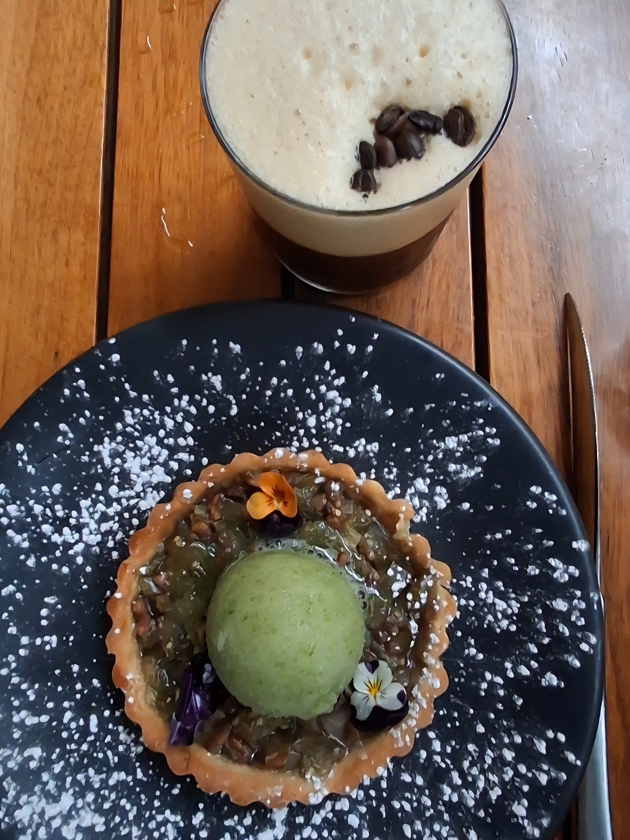 ¿Qué puedo decir del postre? ¡Completamente inesperado! Una tarta de tomate caramelizado con helado de nopal. Dulce, fresco y sorprendente: jamás pensé que me gustaría tanto.