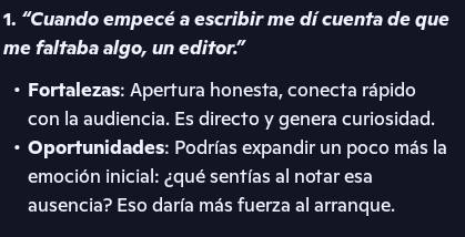 En mi experiencia, este asistente no sustituye la creatividad ni voz del autor, más bien nos ayuda a pulir lo que ya tenemos.