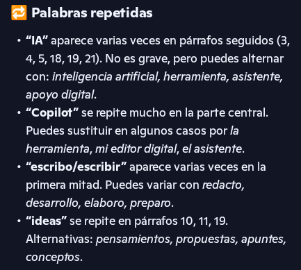 - Se lo vuelvo a enseñar, pero esta vez para que me diga qué tanto repito palabras en todo el artículo y posibles errores ortográficos y/o gramaticales.